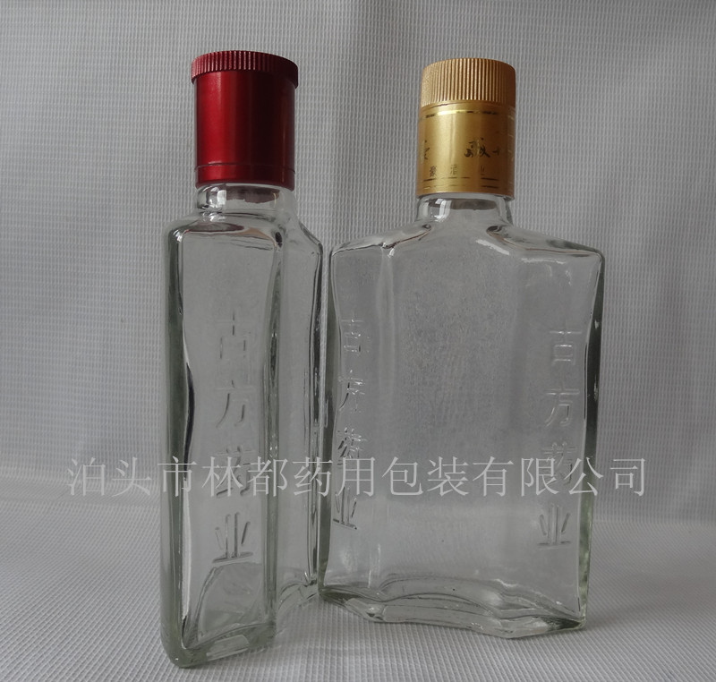 這款保健酒瓶(如圖所示)的容量為100ml ,是我公司為廣西古方藥業(yè)設(shè)計(jì)開模生產(chǎn)的,瓶身上刻有古方藥業(yè)的字體。 所采用的材質(zhì)為晶白料玻璃。