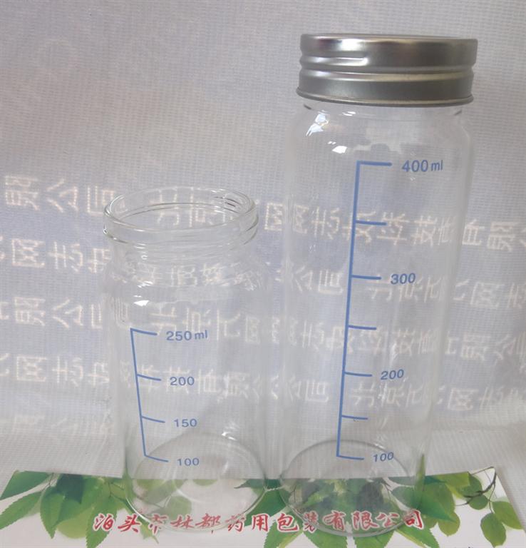 如圖中所示,這是一款容量為400ml, 以高硼硅玻璃管為原料的玻璃瓶, 瓶口為螺旋口,配有金屬蓋子和硅膠墊片,所配套的蓋子和墊片,都可以高溫滅菌,保證產(chǎn)品的安全潔凈。