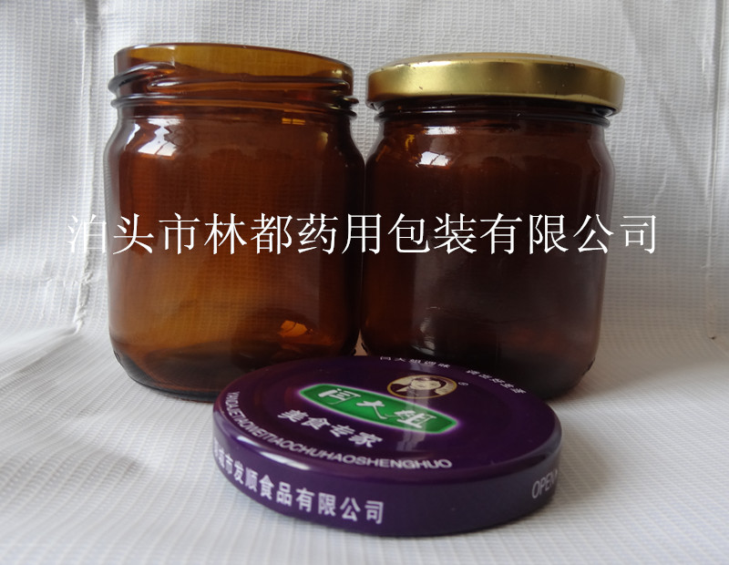 這是一款主要盛裝食品、保健品的廣口瓶,可盛裝膏狀產(chǎn)品、粘稠產(chǎn)品、醬菜等。這種瓶口較大,方便這么產(chǎn)品取用,配的蓋子是馬口鐵的。 蓋子可根據(jù)客戶要求印刷,如圖中馬口鐵蓋子上印有“閏大姐”,顏色為紫色的。